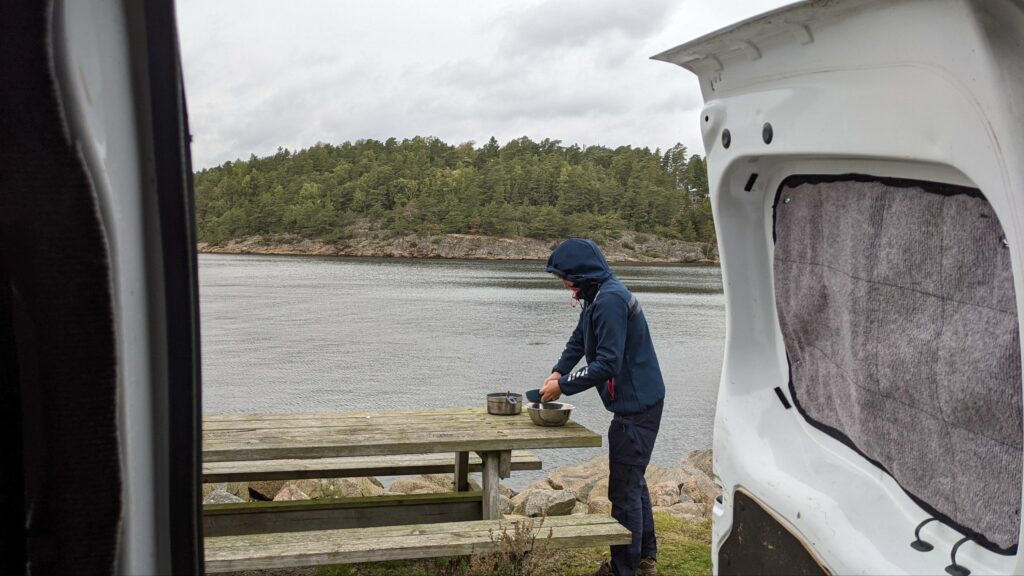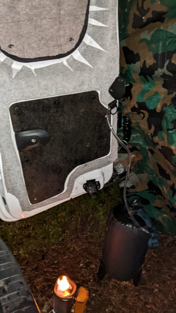 De nombreux kilomètres plus loin, on va devoir s’arrêter pour la nuit. Mais comme on est bien isolé, on va en profiter pour prendre une petite douche grâce à la douche solaire… sans soleil 🥶🥶 (merci les Simomo 😄) !!