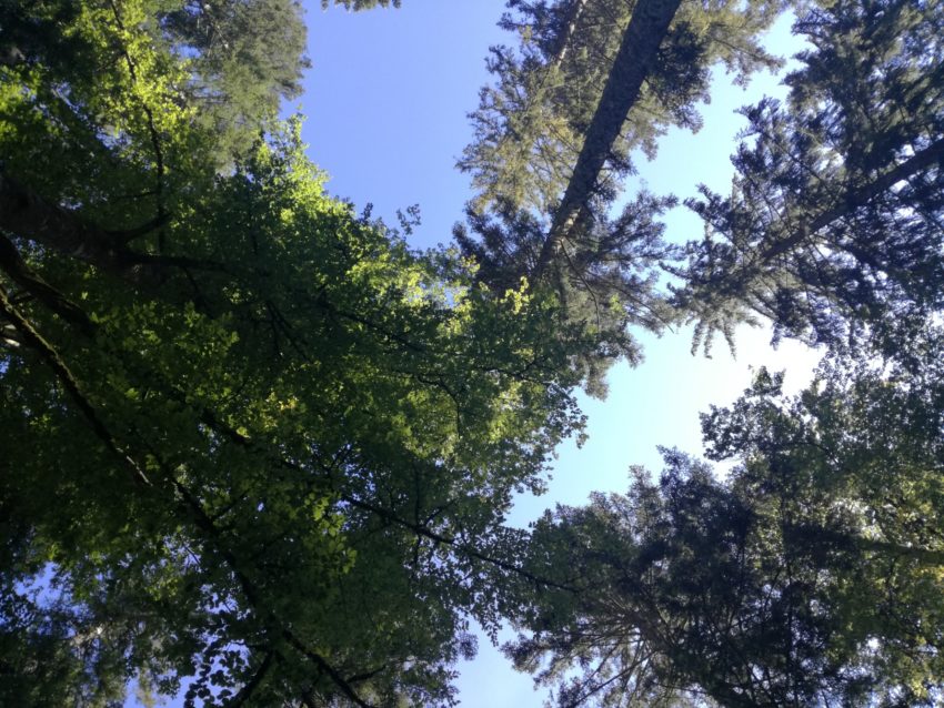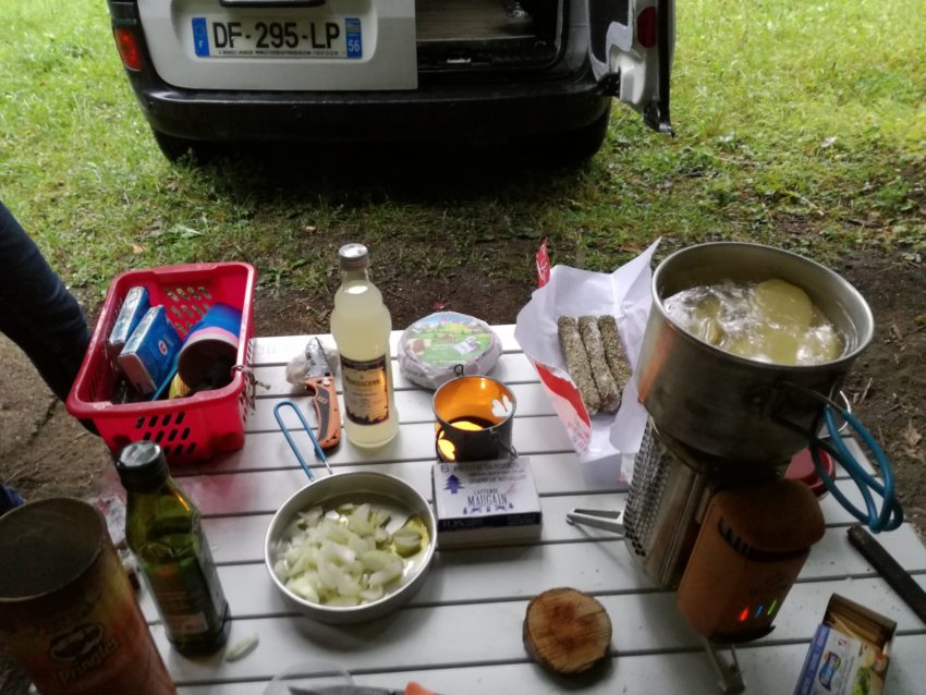 Quel plaisir en se réveillant, d’avoir cette vue au-dessus de nos têtes : Et nous on se dit : « c’est pas parce qu’on vit dans une forêt, qu’il faut manger des baies ! ». Étant près de Montbéliard, nous avions acheté des saucisses. – « Et si on se faisait un rougail-saucisses ? » Emporté par la joie…