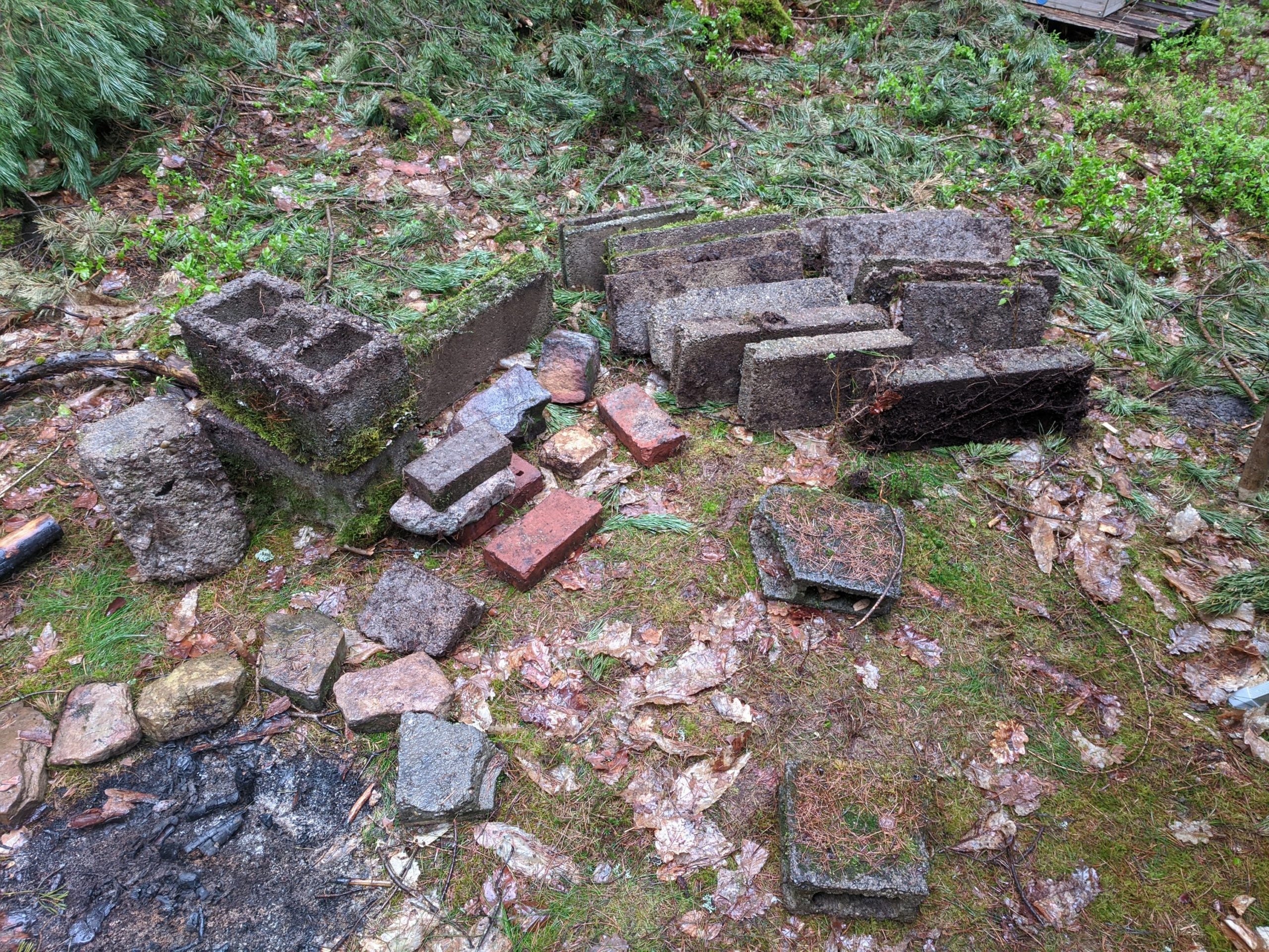 En étudiant les ressources que le terrain pouvait nous offrir nos pieds ont heurté quelque chose, bien enfoui sous la mousse… Oh un parpaings ! Ah un autre… Et nous voilà avec beaucoup de parpaings…