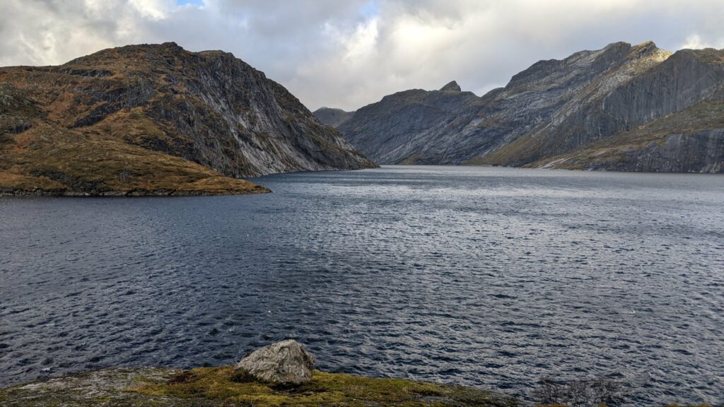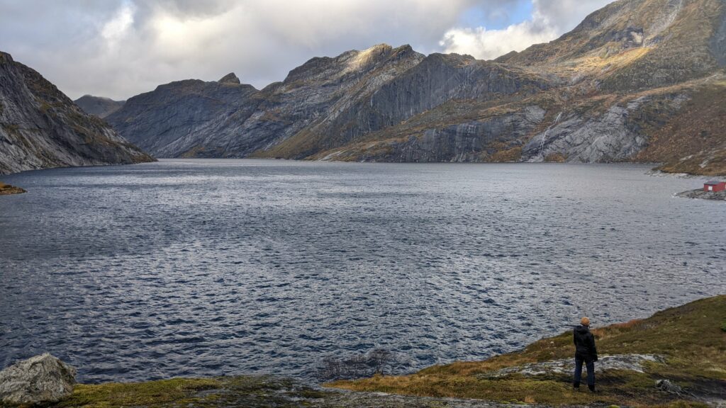 Dès le lever, petite mise en jambe pour aller visiter les environs, dont ce petit chemin bien pentu qui nous amène sur un magnifique lac.